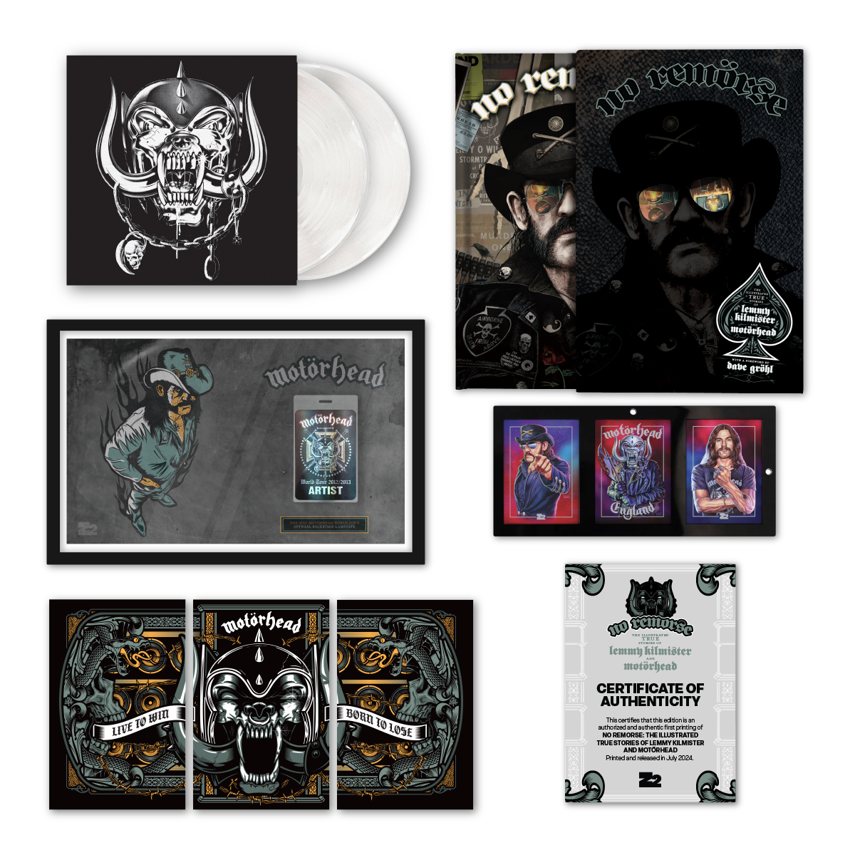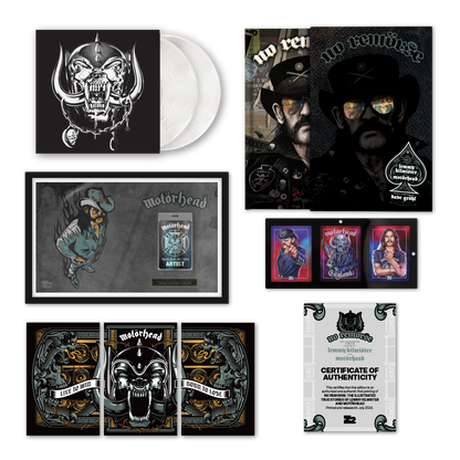 NO REMORSE: The Illustrated True Stories of Lemmy Kilmister and Motörhead To celebrate the upcoming 50th anniversary of the legendary Motörhead, Z2 has gathered some of the greatest living musicians (Ozzy Osbourne, Lars Ulrich, Slash, Chrissie Hynde, Dave Navarro), writers (Neil Gaiman, Michael Moorcock), pro-wrestlers (Triple H, Corey Graves). TV & Film (Matt Pinfield, Penelope Spheeris) and bandmates (Phil Campbell, Mickey Dee, Slim Jim Phantom) to their personal stories of encounters with the man who truly defined what it meant to be the living embodiment of Rock & Roll, Lemmy Kilmister. Featuring a brand-new foreword by his dear friend Dave Grohl (Nirvana, Foo Fighters) this 176-page book pairs 28 rockstars with 28 acclaimed illustrators (Including Dave Chisholm, Bob Fingerman, Brent Engstrom, Joe Simko, and Jim Mahfood) to bring these incredible TRUE TALES of Lemmy Kilmister to life. The cover art is illustrated and designed by Tim Bradstreet (Punisher, Hellblazer) and features a die-cut slipcase and Lemmy’s holographic aviator specs!